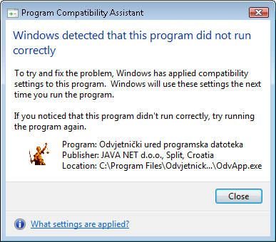 Na žalost, Windows Vista može bez znanja korisnika promijeniti Compatibility postavke, koje se nije moguće vidjeti u program Compatibility dijaloškom okviru. Ovoj greški najčešće prethodi dijaloški okvir na sljedećoj slici.