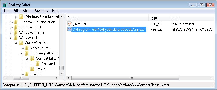 HKEY_CURRENT_USER\Software\Microsoft\Windows NT\CurrentVersion\AppCompatFlags\Compatibility Assistant\Persisted, a u desnom označite "c:\Program Files\Odvjetnicki ured\OdvApp.exe", kao na sljedećoj slici, te pritisnite tipku Del ili iz Edit izbornika izaberite naredbu Delete. - Zatvorite Registry Editor i ponovo pokrenite program.