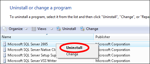 - U popisu instaliranih programa pronađite Microsoft SQL Server 2005, kliknite na njega desnom tipkom miša i iz padajućeg izbornika izaberite naredbu Uninstall.