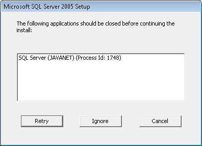 - Ukoliko se prilikom procedure uklanjanja Microsoft SQL Servera 2005 na zaslonu pojavi dijaloški okvir sa sljedeće slike, zaustavite JAVA NET Microsoft SQL Servis na način opisan ovdje i kliknite na Retry.