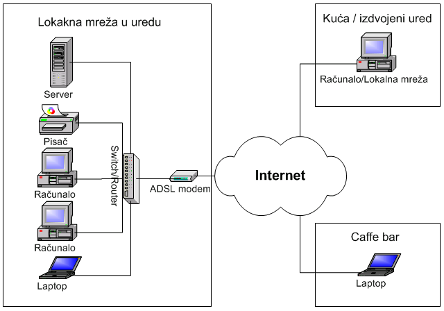 Tipičana lokalna mreža odvjetničkog ureda izgleda kao na lijevom dijelu sljedeće slike. U praksi se često javlja potreba spajanja računala koja nisu fizički u uredu (tzv. udaljene lokacije), bilo da se radi o izdvojenom uredu u nekom drugom gradu ili o potrebi privremenog spajanja iz trenutne lokacije prijenosnim računalom putem GPRS/EDGE/HSDPA usb modema.