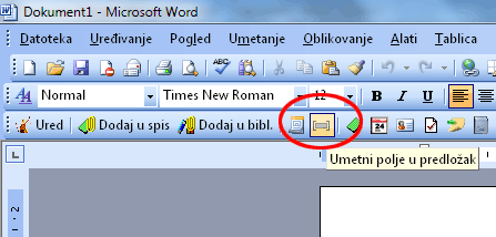 Polja se u dokument unose putem alatne trake na način da kliknete na ikonu Umetni polje u predložak kao na slici, te se iz dijaloškog okvira Umetanje polja u predložak izabere polja koje se želi dodati dokumentu.