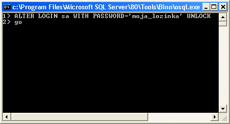 - Na zaslonu će se pojaviti crni "Command Prompt" prozor u kojem će biti prikazano samo 1>, te treptući kursor. U ovaj prozor upišite ALTER LOGIN sa WITH PASSWORD = 'moja_lozinka' UNLOCK, pritisnite Enter, te u novoj liniji upišite go i pritisnite Enter kao na sljedećoj slici.