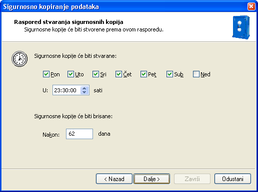 - Na stranici Raspored stvaranja sigurnosnih kopija odredite kad želite da se pokrene izrada sigurnosne kopije baze podataka, nakon koliko dana će biti automatski brisane i kliknite Dalje. Preporučujemo spremanje sigurnosnih kopija svakog dana u vrijeme kad nitko ne radi, te da ih zadržite barem 60 dana.