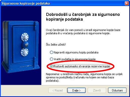 - Na pitanje Što želite učiniti? izaberite Postaviti automatsko stvaranje sigurnosnih kopija i kliknite Dalje kao na sljedećoj slici. Ako se ne nalazite na poslužitelju program će javiti poruku 'Ova mogućnost je dopuštena samo na poslužitelju (serveru) odnosno računalu na kojem se nalazi baza podataka'. Zbog sigurnosnih razloga, izrada automatskih sigurnosnih kopija je dopuštena samo na računalu na kojem je instalirana baza podataka.