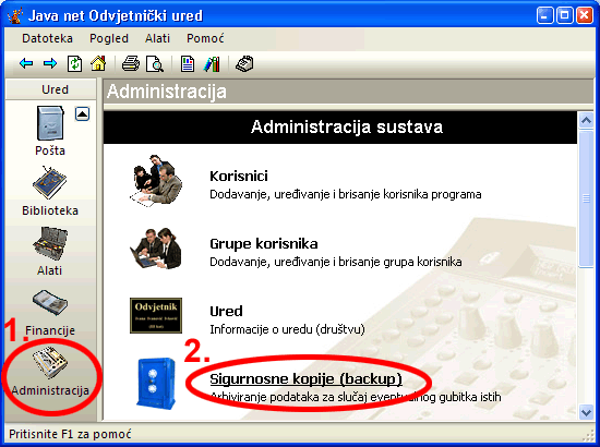 - U Odvjetničkom uredu izaberite modul Administracija te zatim kliknite na Sigurnosne kopija (backup) kao na sljedećoj slici.