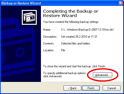- U Completing the Backup or Restore Wizard stranici kliknite na Advanced kao na sljedećoj slici.