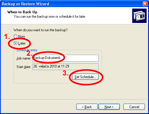 - Na stranici When to Back Up izaberite Later upišite proizvoljni naziv za Scheduled Tasks zadatak, te kliknite na Set Schedule kao na sljedećoj slici.