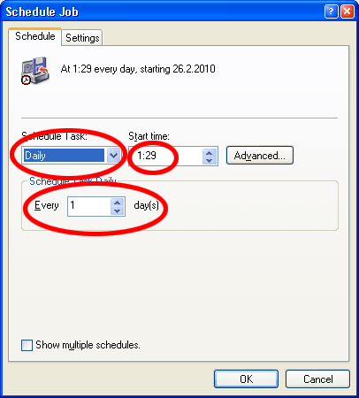 - U Schedule Job dijaloškom okviru, za Schedule Task izaberite Daily (Dnevno), odredite vrijeme kad će se izrada sigurnosnih kopija pokrenuti (kasno navečer ili rano ujutro), te za Every upišite 1 dan, kao na sljedećoj slici i na kraju kliknite OK.