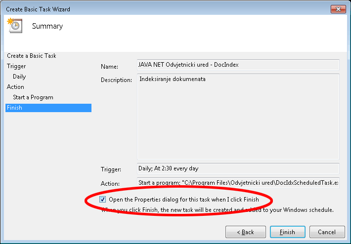 - Na posljednjoj stranici označite Open the Properties dialog for this task when I click Finish, te kliknite Finish za stvaranje zadatka.
