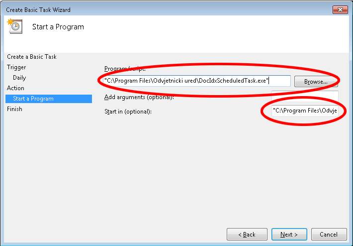 - Na sljedećoj stranici u polje Program/script upišite "C:\Program Files\Odvjetnicki ured\DocIdxScheduledTask.exe" (s navodnicima), a u polje Start in (optional) možete, mada nije obvezno, upisati "C:\Program Files\Odvjetnicki ured". Kliknite Next.