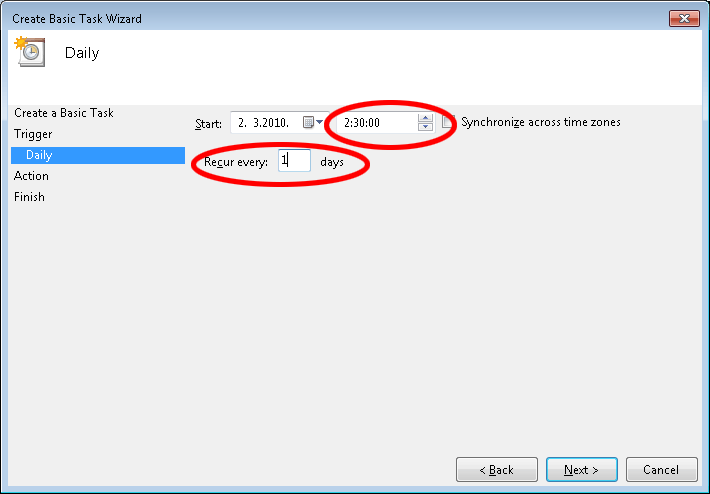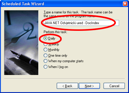 - Na sljedećoj stranici, upišite naziv zadatka (preporučujemo JAVA NET Odvjetnicki ured - DocIndex, jer je to naziv koji će se u budućim verzijama Odvjetničkog ureda koristiti za ažuriranje zadataka iz modula Administracija), te izaberite Daily, kao na sljedećoj slici.