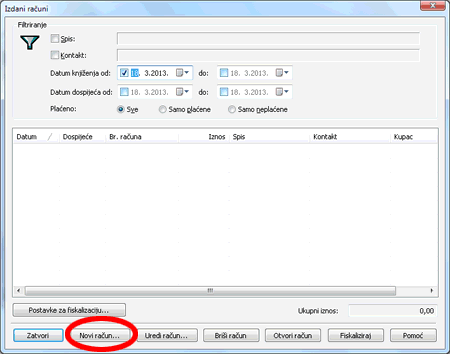 - Na zaslonu će se pojaviti dijaloški okvir sa prikazom izdanih računa. Kliknite na Novi račun... kao na sljedećoj slici.