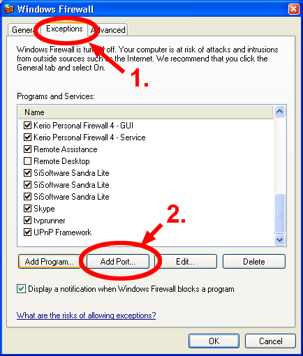 - U Windows Firewall prozoru kliknite na Exceptions, a zatim na Add port kao na sljedećoj slici.