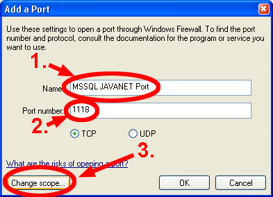 - U Add a Port prozoru u polje Name (naziv porta) upišite proizvoljni naziv porta, a u polje Port number upišite zapisanu vrijednost iz koraka 3. Na ovaj način ste otvorili pristup bazi podataka svim računalima (koji znaju lozinku baze podataka) iz lokalne mreže i sa Interneta. Ukoliko želite dopustiti pristup samo računalima u lokalnoj mreži (preporučljivo) i/ili samo određenim računalima pritisnite Change scope.
