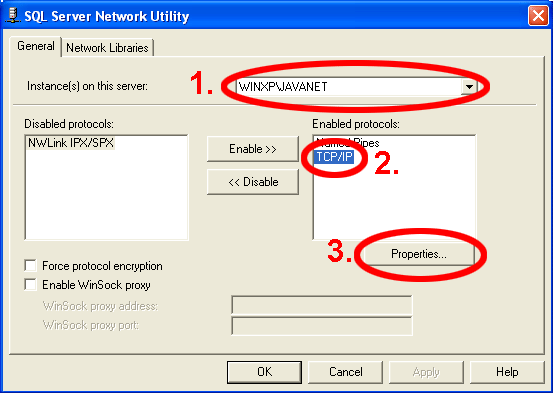 - Na zaslonu će se pojaviti dijaloški okvir kao na sljedećoj slici. U "Instance(s) on this server" izaberite NazivVašegServera\JAVANET, zatim izaberite TCP/IP te na kraju pritisnite Properties.