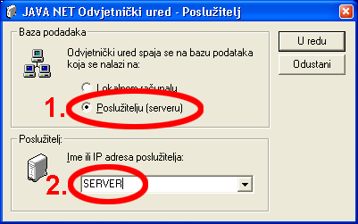 - U programu Adresa poslužitelja, provjerite da li su upisani točni podaci o lokaciji baze podataka. Na serveru bi trebalo biti označeno da se baza nalazi na lokalnom računalu, a kod ostalih računala na serveru, te bi trebao biti upisan naziv ili IP adresa servera).