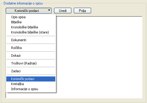 Ukoliko vam standardna polja kojima se opisuju spisi u Odvjetničkom uredu nisu dovoljna, možete definirati dodatna korisnička polja.