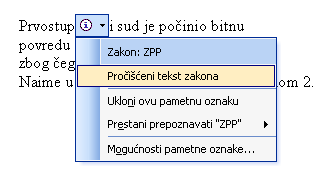 U gornjem primjeru su pametne oznake Odvjetničkog ureda unutar Microsoft Worda prepoznale uobičajenu skraćenicu Zakona o parničnom postupku. Da biste vidjeli koje akcije možete napraviti nad tom pametnom oznakom, pozicionirajte pokazatelj miša nad podcrtanim tekstom i pričekajte jednu sekundu dok se ne pokaže gumb Akcija pametnih oznaka.![]()