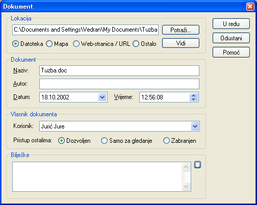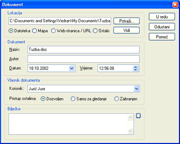 Dokument može biti datoteka na disku (bilo kojeg tipa), mapa (zgodno ako sve dokumente vezane za neki spis držite u istoj mapi) ili stranica na internetu.