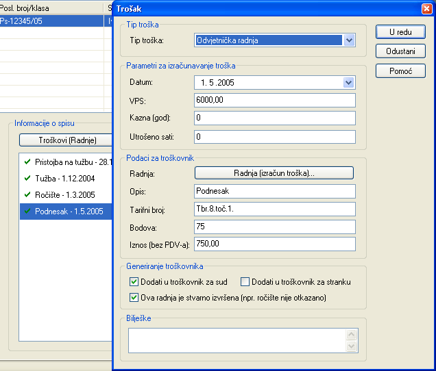 Odvjetnički ured kreira troškovnike ovisno o vašoj odluci automatski ili poluautomatski, a naravno troškove je moguće uređivati i ručno, bilo automatski bilo ručno dodane troškove.